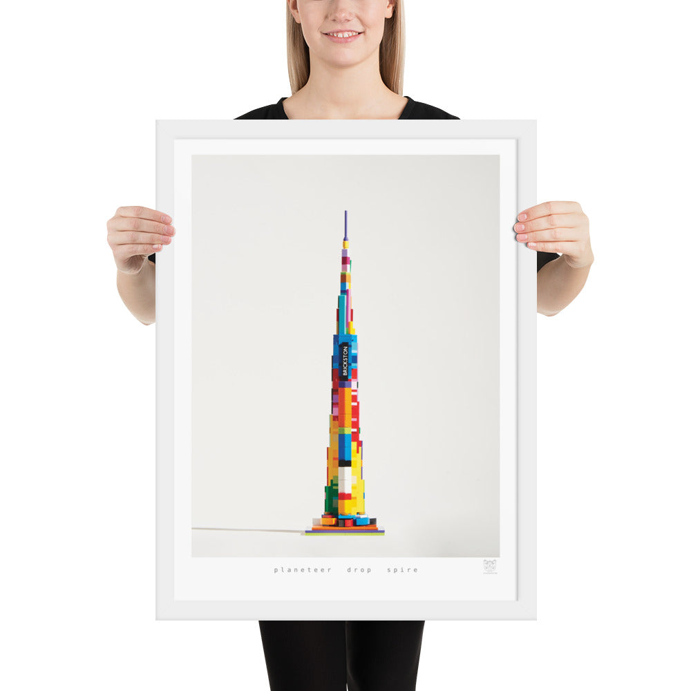 Framed print of "Planeteer Drop Spire", the color-pixelated version of the 2nd LEGO® Burj Khalifa, the tallest building in the world. Make a statement in any room with this framed poster, printed on thick, durable, matte paper. The matte black frame that's made from wood from renewable forests adds an extra touch of class.
